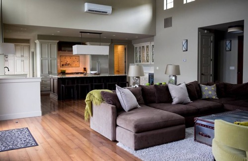 •Stunning 15 foot ceilings with stained rough-hewn beams.