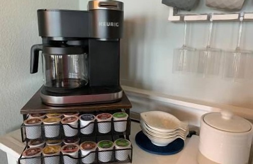 You will also find a FULLY stocked kitchen with all the conveniences of home. Everything you need to prepare a family meal and serve it in style, is provided. We also have an over-the-top coffee and tea bar for your drinking pleasure. Appliances include a mixer, blender, toaster, skillet, Keurig coffee maker, microwave, a full refrigerator, a dishwasher, and an electric range and oven. Grills are found around the property. We do supply grilling utensils. We also do our best to keep common spices, coffees, teas, sugars, creamer, foils, wraps, bags, cleaning supplies, and Tupperware stocked. We also have bar supplies, wine, and champagne glasses for adult beverages.