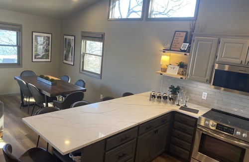 This newly renovated home is just steps from a magnificent 180 degree view of the lake. Spend a lazy day with family and friends on either of 2 decks gazing at the natural beauty of the lake crowned with scenic hills in the distance and unspoiled views of the shoreline. Or, have an active day in the water just steps from the house. Launch your watercraft from Southpark, just a 5 minute drive away and directly across from the house. A short boat ride (a few minutes) across the cove, anchor directly behind the house and play in the lake all day. It is a great home base for exploring this uncrowded, pristine part of Beaver Lake with its stunning limestone bluffs. There is so much beauty in this part of the Ozarks with over 28,000 acres of lake to boat, fish, ski, kayak or find an interesting spot to dock and explore the 500 feet of shoreline with numerous caves. When you tire, boat back to the cove and anchor for easy access to the house, you can break whenever you like... go in for a nap, another drink, watch TV or grab a bite.