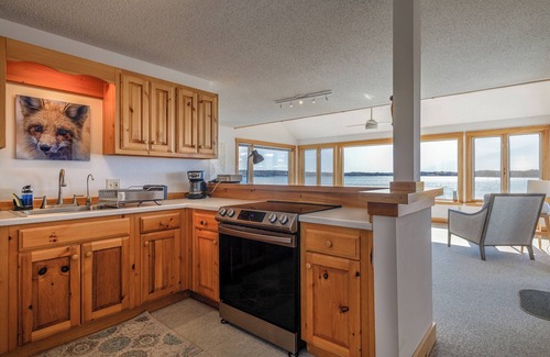 Inside, the home offers an open-concept living area with vaulted ceilings and comfortable seating. This 2-bedroom, 1 bath home has water views from every room. Downstairs has the bedrooms, living room, bath and kitchen. The primary has a king bed, while the other bedroom has a queen bed. Upstairs is a loft with full bed and futon. It's a great set-up for a multigenerational family with the older generations downstairs and the younger upstairs.