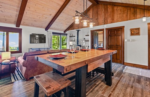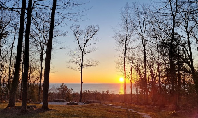 Panoramic sunset views from the top of a bluff overlooking the bay of Michigan. This property is private, wooded with gorgeous hardwoods and birch tress, and fully stocked for you. We love to pamper our guests and give them the best vacation experience. The outdoor space provides a stone firepit overlooking the bluff and offering a fantastic oasis to sip Door County wine and watch the sunset or even enjoy the daytime views nighttime sky filled with stars. The back porch is covered and great for grilling. Inside you have a cozy setting all your own, with a large master bedroom offering view of the lake from the king sized bed, washer/dryer, and attached bathroom. The main space is updated and upgraded with a fully stocked kitchen, open concept living space with electric heat as well as a wood burning stove to keep you nice and warm even on those cold Wisconsin winters. This property is 15 minutes north of Sturgeon Bay, 8 minutes south of downtown Egg Harbor and a few minutes drive to the Rusty for Breakfast, or a delightful coffee shop right in Carlsville. Property is fully cleaned top to bottom between bookings, and full stocked with blankets, pillows, dishes, and much more.