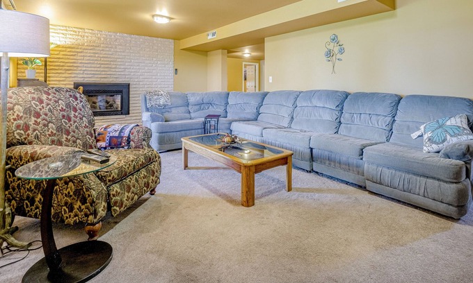 This lower-level retreat is part of a duplex and features a cozy interior that invites you to unwind. Stretch out on the spacious sectional in the living area and stream your favorite shows on the TV. A gas fireplace adds comfort and allure to the space, while a desk provides a convenient spot to write postcards or check emails. While the chef in your group prepares dinner in the kitchen, rack up the pool table for a game. When it's time to eat, gather at the dining table. Additional amenities include a Peloton bike.