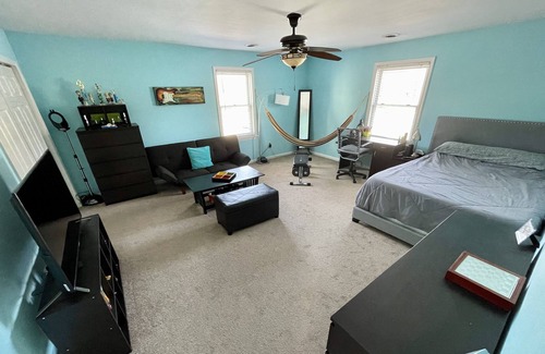 Studio: fits several twin air mattresses, converts to 5th bedroom with a door that locks and blinds that close. We usually set up one queen air mattress here, can provide several twin mattresses instead.