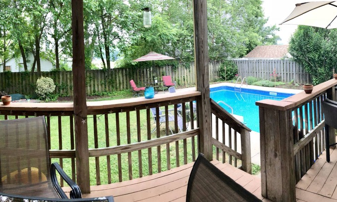5 bedrooms, 3.5 bathrooms, in ground pool, yard with grass, upper and lower decks, BBQ grill, screened-in porch, plenty of seating and 4 private parking spots. More free, street side parking available.