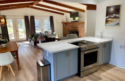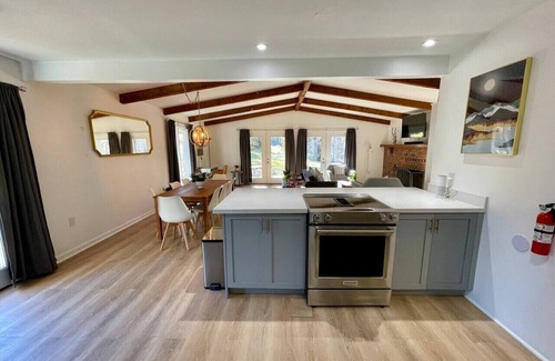 The home offers a cozy fireplace, 3 smart TVs, a workstation, 2 full baths, a fully equipped kitchen, private parking, outdoor seating, and a firepit. Experience modern comfort amidst nature’s beauty. Your unique getaway awaits!