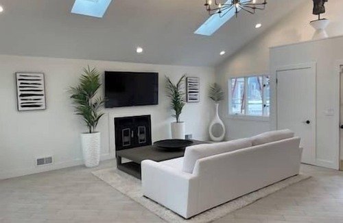 The large, gourmet kitchen is equipped with a stainless steel refrigerator, dishwasher, stove, oven, and microwave, as well as an array of cooking utensils for your convenience. Enjoy a meal in the elegant dining room, furnished with high-end Restoration Hardware pieces.