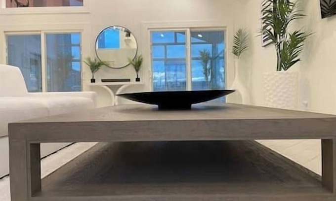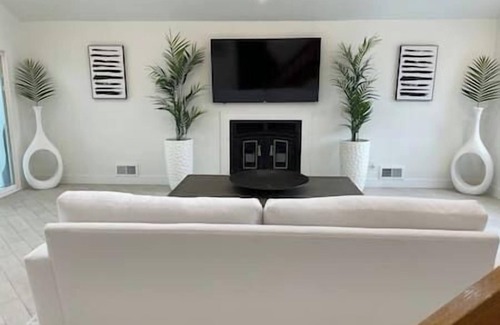 Our spacious, all-white home features 20-foot ceilings and large windows throughout, providing you with unobstructed views of the serene lagoon. The stylish and modern artwork adds a touch of sophistication to the bright and airy living spaces. The open-plan living room features a cozy fireplace and a 65-inch TV for your entertainment.
