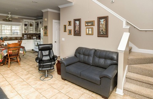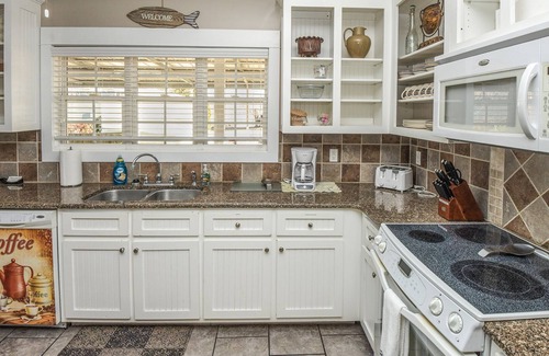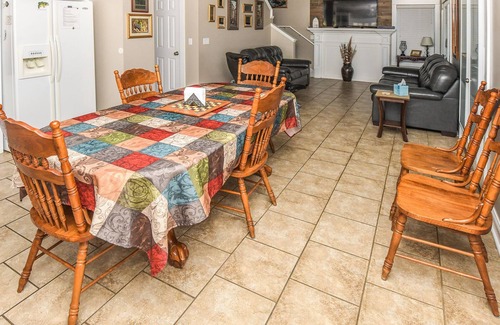 You'll enter our lakefront home into the well stocked kitchen with plenty of counter space, Calphalon cookware and all appliances including a dishwasher to help you create memorable meals. Our open floor plan offers visibility straight through from the kitchen to the great room making communication with your family and friends a breeze (pun intended...)