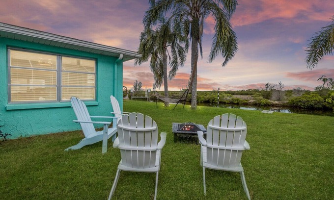 Welcome to Leisure Isle — a peaceful 2-bedroom waterfront retreat perfect for couples, families, or friends. Enjoy the water view, a firepit for evening s’mores, a grill for outdoor meals, and a full kitchen with a Keurig for your morning coffee. Relax in the cozy living room after a day of exploring, or soak in the serene sunset views right from the backyard. Close to beaches, dining, and local attractions, this is your ideal Florida escape.