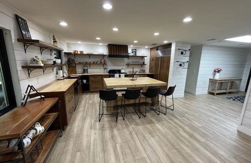 The kitchen is just as beautiful and unique as it is functional. A gas stove, oven, coffee station, toaster, dishwasher, and microwave are all available for use.