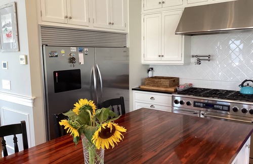 The gourmet kitchen has Dacor commercial range and hood, beautifully hand painted cabinets, 9 ft exotic wood center island with additional bay view dining area for cooking in for the family.