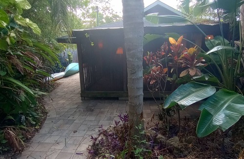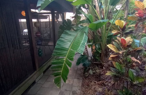 Waterfront Cute Tropical jungle to sit out back and enjoy the fire pit with a beverage. It is a quaint little town with fishing and shrimping, visit Hudson Beach, Inn On The Gulf, Sam's Beach Bar and watch the shrimp boats come in. Get Hooked and Ollie's on the beach is more local favorite restaurants or get some ice cream at Hudson Beach cream parlor and All is within a few minutes drive. Cute little Cottage with Lush Tropical Foliage so thick you would think your in a jungle. The cottage is on the water so launch the provided kayaks straight from the floating dock. just 5 minutes Kayak to the open Gulf waters. We have installed a Kayak saddle on the side of the Floating Dock for easy in and out with the Kayaks. From the moment you pull up to the home and enter through the double gate you will think that you are in a Tropical Paradise with the many Palms and plants and flowers. You have all the amenities here that you would at home AC, Heat, Pots, Pans, Utensils, Coffee Maker, Microwave, etc., Towels, Linens, W/D unit.
