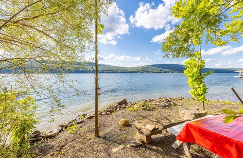 FULLY FURNISHED WATERFRONT CANANDAIGUA LAKE DREAM HOME WITH 165 FT OF PRIVATE BEACH AND DOCK. YOU’LL BE AMAZED BY THE BEAUTY AND TRANQUILITY OF THIS HOME. UPON ENTERING YOU’RE GREETED WITH A SPACIOUS AND WELCOMING FOYER. THE CATHEDRAL CEILING, WOOD BEAM FAMILY ROOM IS FULLY FURNISHED AND COMFORTABLY ACCOMMODATES ALL YOUR FAMILY & FRIENDS. ON CHILLY NIGHTS CURL UP IN THE STONE WOOD BURNING FIREPLACE LIVING ROOM. OR PERFECT FOR YOUR MORNING COFFEE. WITH AN ADJACENT UPDATED FULL BATH – INCLUDING CLAW FOOT SOAKING TUB. THE “WHITE & BRIGHT” KITCHEN FEATURES A BREAKFAST BAR, GAS STOVE, DISHWASHER AND DINING SEATING. AFTER A LONG DAY OF BOATING ON CANANDAIGUA LAKE IMAGINE RELAXING ON THE FULLY SCREENED OUTDOOR LIVING AREA. FEATURING OUTDOOR DINING, CHARMING SEATING AREA, AND 3 QUEEN SIZE BEDS. ON THE SECOND FLOOR THIS HOME HAS 3 PRIVATE BEDROOMS (2 QUEEN & 1 TWIN BED) AND AN UPDATED FULL BATH. STEP OUTSIDE TO ENJOY THE OPEN DECK OVERLOOKING YOUR PRIVATE BEACH. RINSE OFF IN THE OUTDOOR SHOWER ON THE HOT SUMMER NIGHTS. THIS AMAZING WATERFRONT PROPERTY OFFERS PLENTY OF BEACH ACTIVITIES, PRIVATE DOCK AND HOIST. TOTAL SLEEPING CAPACITY 11 (QUEEN AIR MATERESS AVAILABLE AT ADDITIONAL COST)