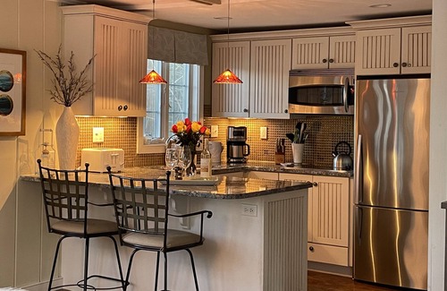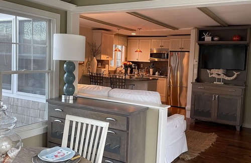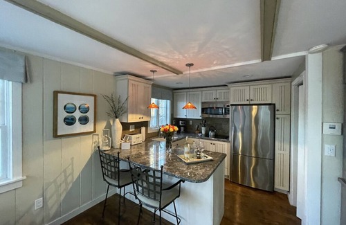 The two bedroom cottage interior boasts an easy living, open concept kitchen/living/sunroom area with dining, along with king and queen bedrooms. Recently renovated, the house has hardwood floors, freshly re-finished walls, stainless steel appliances, newly renovated and equipped kitchen, and beautiful furnishings throughout. The bathroom refurbishment includes a new tile and glass shower, all new fixtures, flooring, cabinetry and lighting. Our home is impeccably clean and sanitized….. and ready for you!