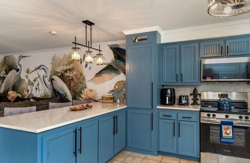 The Cajun Queen is completely renovated, new color scheme, luxury touches, full kitchen, lux bathroom, separate children's bedroom, screened in sun room with a direct view to your private bayou scene. A welcoming walkway from the sunroom leads you directly to the deck with a breathtaking view of mature cypress trees lining the outer river bank bordering a peaceful scenic bayou floating by in front of you.