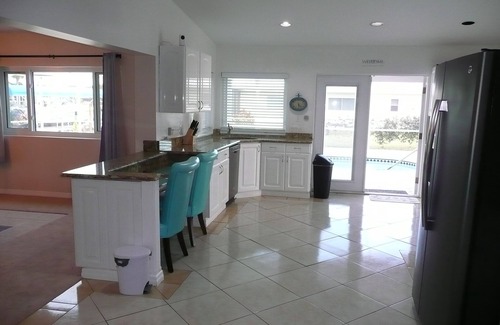 Large airy rooms with Cathedral ceilings, Kitchen is about 25' by 12' . Pool Lanai is 32' by 52' (1664 sq') with fine mesh. Main house is 2300 Sq' .The "Sun Room" is 28'x10' will be your new favorite place to sit and enjoy your morning coffee. About 4300sq' play area. Look out to the very wide canal and you may see a dolphin pass by along with boats of all types and size. Dolphin Video picture #3 "View From Dock"