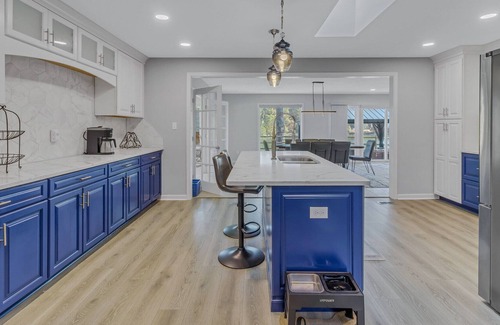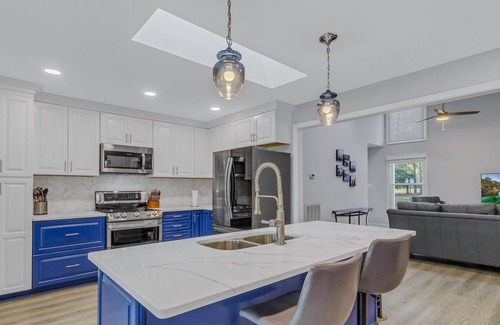 Our custom dining room table is a work of art, with walnut and epoxy resin, resembling a serene "river." You can savor family meals with a view of the pond and seating for eight. The well-appointed kitchen boasts stunning quartz countertops, a seated island, and a full range of appliances and gadgets. Make coffee with the Keurig K-Duo Plus, whip up waffles, or create gourmet dishes with all the spices and tools you need. A full feast awaits!