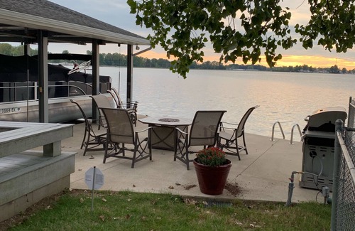 Covered boat house with electric lift for pontoon boat. Swim ladder off patio.