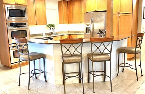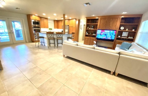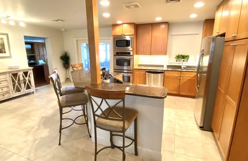 Enjoy this waterfront gateway. No hurricane damage. New heated pool and spa. Bring your boat, 35ft dock space/50amp. Sleeps 8. 3 spacious bedrooms. 4 beds. Primary suite includes a soaking tub and shower room. Queen size Murphy bed in Den. 3 full bathrooms. Theater/gaming room. 2 electric fireplaces. Smart TVs. Full indoor bar with wine refrigerator. Outdoor kitchen with TV and ice maker. Spacious outdoor eating and lounge area. Cozy seating by the fire pit. Private driveway/parking. Beach Chairs/Umbrella, pickleball paddles. Minutes to airport, restaurants and beaches.