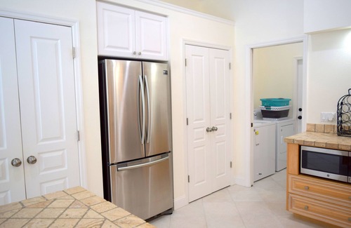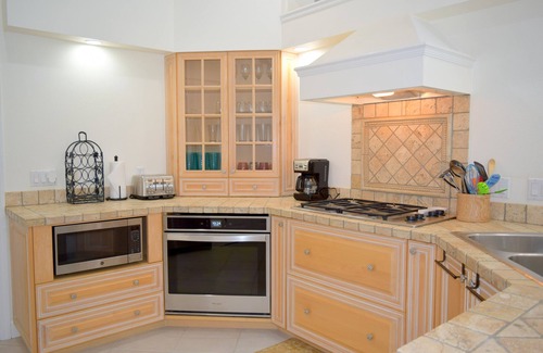 The kitchen has all up-to-date appliances: refrigerator with a bottom pullout freezer, gas range, electric oven, microwave, and dishwasher. A spacious pantry unit provides storage for food, while a separate unit holds dishes. The kitchen is completely furnished with everything from crock pot to coffee pot, blender to mixer, and complete cooking utensils. Place mats, cloth napkins, tea towels and kitchen hand towels are neatly tucked in kitchen drawers for ready use. There is a complete set of cookware and sets of dishes and eating utensils for eight.