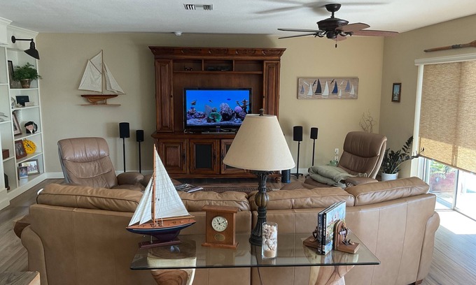 Consider this house your home away from home while you visit Port Charlotte and Punta Gorda Florida. This enchanting property features 2 bedrooms with a king and queen bed, two bathrooms ( shower in one- tub in the other). Amenities include WiFi, heating/air conditioning, and a washer and dryer for your convenience. Guest can relax and unwind in this beautiful completely remodel water front home as you watch all the birds - beautiful sunrise and just a very peaceful and relaxing atmosphere. Please bring your boat ( up to 45 ft) and keep it at our dock which is included in the monthly fee.