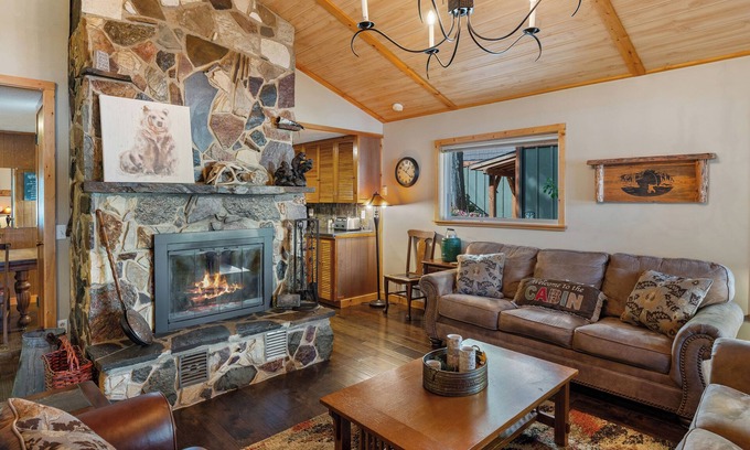 Inside, the home spans 1,500 square feet, thoughtfully designed to accommodate families or groups. The downstairs features a cozy living area with a wood-burning fireplace, a fully equipped kitchen, and a dining space that invites lingering over meals. This level also includes a comfortable bedroom with a queen bed and a full bathroom. For additional sleeping options, the living room sofa converts into a sleeper, making it ideal for overflow guests.
