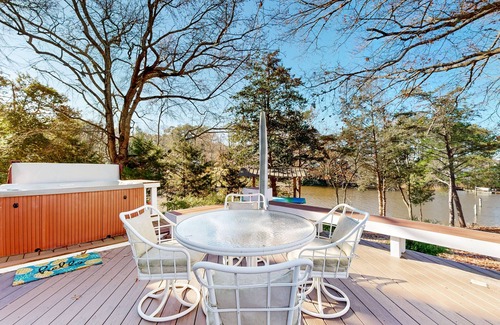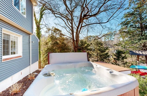 Nestled among the trees on the beautiful banks of Mill Creek, this waterfront home in Lusby boasts nearly 360-degree views of an inlet of Chesapeake Bay. Tranquil and scenic, this expansive piece of property is a place for launching kayaks from the dock each morning, afternoons of playing on the beach nearby, and evenings spent stargazing in the blissful warmth of the hot tub.