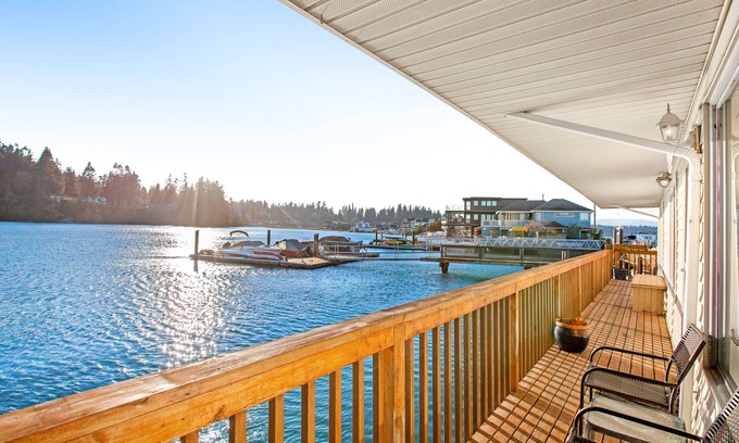 Inside, the living space is full of light, with picture windows that wrap the corners and bring in gorgeous views of the water and mountains. After a day of paddling out on the sound, curl up by the wood-burning fireplace and stream your favorite movies on the smart TV. A roomy dining area leads into a polished kitchen with stainless steel appliances and a glass-tile backsplash. Other features include two waterfront bedrooms, a washer/dryer, and complimentary WiFi.