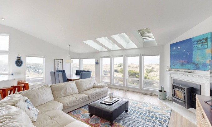 Enjoy your next adventure to the Oregon Coast at this beautiful beach house. This rental has gorgeous ocean views, a private hot tub, a gas grill, and even a Ping-Pong table in the garage. Inside you will find a modern, open layout with a warming pellet stove and plenty of space for your group, along with all of the conveniences you should expect.