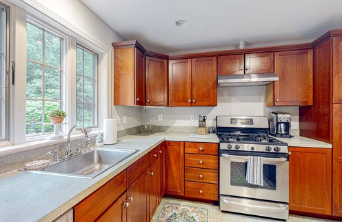 Inside, the sunlit living room provides a peaceful place to sit and stream your favorite TV shows and movies. When you aren't hanging out here, head for the fully furnished sunroom. The chef of your family will adore the full kitchen's cherry wood cabinetry, stainless steel appliances, and breakfast bar. Indulge in tasty treats at the breakfast bar or gather around the formal dining table for family-style meals.