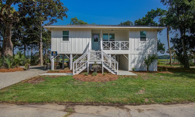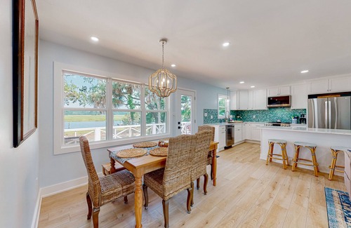 A classic Lowcountry scene awaits at this lovely beach cottage, serenely tucked among the trees on the bayfront in Edisto Beach. It's the perfect getaway - a place to walk three short blocks to the beach, go fishing and crabbing from the private dock, and take in gorgeous sunset views over the Wadmalaw River.