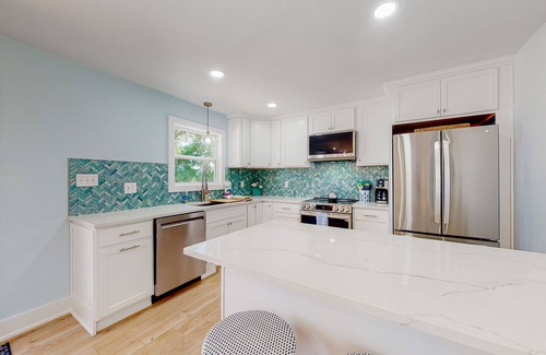 The centrally air-conditioned interior is bright, breezy, and open, with views of the water framed by generous windows. Enjoy a well-equipped kitchen with stainless steel appliances, both a breakfast bar and a farm table for dining, and a living room that's ideal for gathering. In the evenings, stream movies and sports via Hulu+ and Hulu Live, and leave the day's swimsuits and towels to spin in the washer/dryer. Of the three bedrooms, one features an en suite bathroom and its own TV; another offers a desk workspace where you can log onto the complimentary WiFi.