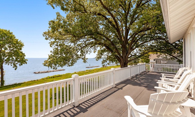 Overlooking Chesapeake Bay, this charming Annapolis home is nestled in the serene Bay Ridge community, just steps away from a private beach. Bring the whole family together and relish watching gorgeous sunrises and sunsets and taking in panoramic bay views from both levels of this home's wraparound porches. When you aren't lounging and watching yellow, pink, and orange hues fill the sky, head for the backyard, where a patio, ample seating, and a gas grill provide the perfect space to host cookouts! The screened, first-level wraparound porch is also a prime location to host crab feasts or barbecues while looking out onto the water.