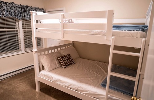 On the main floor upstairs, you’ll enjoy 3 bedrooms and 2 bathrooms. The master has a king bed and en suite bathroom. The second bedroom has another king bed. The third bedroom has full over full bunks. The second bathroom is in the hallway.