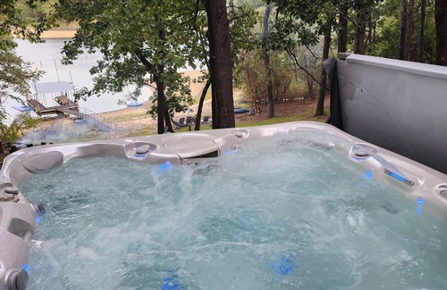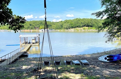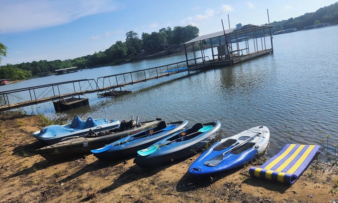 Outside- Out the back patio door you will find the charcoal grill/smoker and plenty of outdoor seating for large groups. The hot tub is out the back door overlooking the lake. The steps will take you to the waters edge and dock area where you can enjoy playing, fishing, swimming, diving, kayaking, pedal boating, or try the paddle board. We offer 3 kayaks, 1 pedal boat, 1 paddle board and 1 floating lillypad. There are beach lounge chairs to soak up the sun or 2 hammocks to lay in the shade close to the water. A short walk down the cleared path is an oversized beach area for the whole group. There's also a "culvert slide" for the kids who will love going down a dark tube located on the hill next to the house. There are a couple fire pits with stump seats to keep it natural. The property is full of oak trees and plenty of small limbs to collect and start your own fire for sâmoreâs. Enjoy the wildlife that passes by daily. The deer thrive on this overloaded 2 acre lot full of oak trees. The geese love landing in our cove as it is a very quiet and peaceful location.