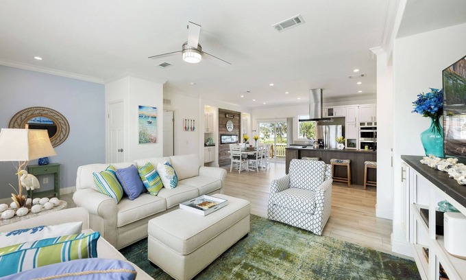 Feel at home in our clean, fully equipped kitchen in the coastal escape on the water. Enjoy a spacious and open living space. It is only a few minutes by boat to Lake Okeechobee with some of the best Big Mouth Bass Fishing! You will find many shops and restaurants within 3 miles of the town's center. A Smart TV in the living room. King bed in the master with a large master ensuite with a vanity desk, chair, a large soaker tub and walk-in shower. Queen beds in the other two bedrooms. On the water!