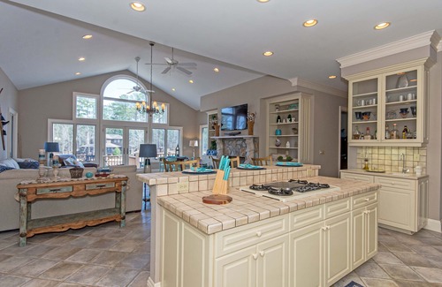 Kitchen - fully furnished with pots, pans, dishes, intensive, and linens: appliances include French door refrigerator/freezer, dishwasher, double oven, microwave, coffee maker, toaster, and toaster oven. Also, includes a pantry, large island with 5 burner gas stove, and large sink.