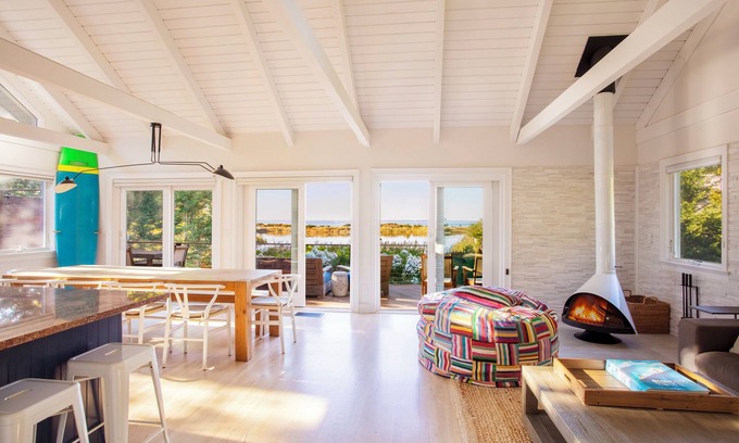 This exquisitely renovated 5br, 3.5ba modern home overlooks Swan Pond & Gardiners Bay, offering stunning sunset views on the water. Relax by the heated pool & large in-ground hot tub or cozy up by the midcentury fireplace. Walk to the beach, enjoy the sonos & smart TV’s, 9 bikes, 4 paddleboards & 3 kayaks, or take in the sunset while you prepare dinner in the fully stocked chef's kitchen. Modern designer furniture promotes effortless indoor-outdoor living with refined simplicity. Registry #24-14