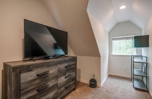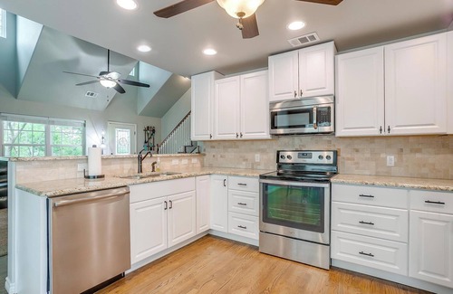 Adjacent to the living room is a fully stocked kitchen equipped with all the cookware and utensils you might need to whip up hearty meals. Gather your crew around the large dining table to plan tomorrow’s lake activities while enjoying a dinner straight off the grill.
