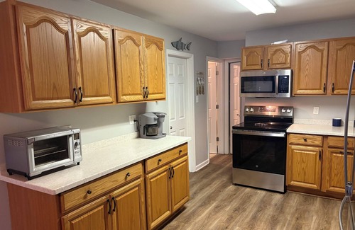 Two full bedrooms on the main level and a huge upstairs that sleeps at least 9 people. The backyard has covered patio with high end furniture, and fire pits (wood and propane). The sunrise from sitting on the back deck and drinking your coffee is peaceful and relaxing. Enjoy the evening sunset and water views from the Adirondack chairs in the front yard. Also very kid friendly with a basketball hoop, kayaks and canoes, scooters, and life size games.