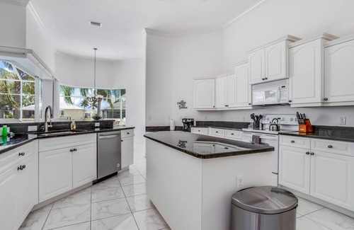 Experience classic Port Charlotte charm in this stunning getaway today and make the most of indoor/outdoor living right on the water. With white tiling throughout, an airy layout filled with natural light, and multiple access points to the back patio and lanai, you will have no trouble spreading out and finding your own piece of paradise. When the sun comes up each day, you'll have no delay in cooling off with the private pool right outside and a dock to dip your toes in the canal with a good book in hand. When you want to prepare tasty snacks between tanning sessions or gourmet meals after full days of fun, the full kitchen is equipped with stainless steel appliances, plenty of counter space, and breakfast bar seating to make meal prep a social event. If you feel like having a more casual cookout, the gas grill and outdoor kitchen area will come in handy as well. When it is time to settle down for the night, the living area offers two plush sofas and a flatscreen TV to stream favorite movies. And, you won't have to be disconnected with free high-speed WiFi that is more than capable of supporting Zoom calls or remote work.
