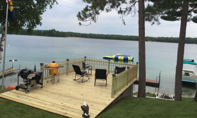 True paradise in Northern Michigan, Clear Lake (Atlanta, MI). 4 bedrooms ,3 baths, sleeps 10. Perfect for a family gathering or a corporate retreat. Amazing property, newly renovated home with updated kitchen and baths, private dock, 20' inflatable water trampoline, lake front entertaining area, floating swimming platform, fire pit, paddle boards, screened porches, grill and much more. Nothing in the area compares to this property. Clear Lake is a 290 acre spring fed lake with crystal clear water, ideal for water sports and fishing. The shallow water and sandy beaches are perfect for the little ones, their is also access to over 70 miles of hiking trails if you are feeling adventurous. Just private enough to get away and busy enough to have a great time. Short drive from town, quick access to groceries and restaurants. The staircase that leads to the lake was finished Winter 2018. Pontoon boat also available for rent for an additional $500/week. NO PETS OR SMOKING ALLOWED