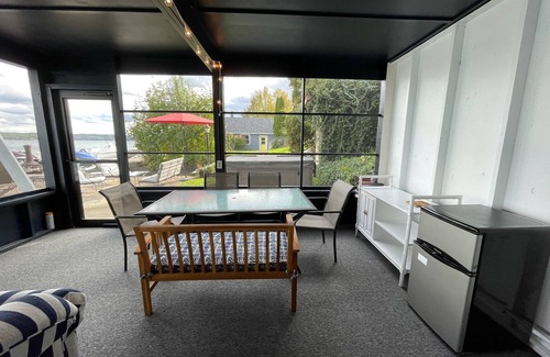 The home itself, offers around 1800 square feet of casual waterfront living. It is a bright, newly remodeled, comfortable home. The upper floor features beautiful hard wood floors, perfect for reducing allergens. There is a full kitchen, dinning/living room area, master bedroom with a king sized bed and a full bath. This property can only be booked through VRBO. The 2nd bedroom has a full size bed. There are sliding glass doors in both the dining area and the master bedroom that open onto a private covered deck that runs the full length of the house. It’s the perfect place to enjoy your morning coffee, or a glass of wine at night. This property can only be booked through VRBO.
