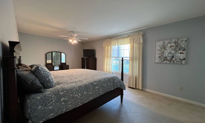 Water front home nestled in quaint village of Bozman with dock/pier for fishing, crabbing or just enjoying what the Eastern Shore has to offer - sipping your beverage of choice from the deck just off the gathering room where there is a fireplace and comfy seating and shelves of games and more. The breakfast nook, counter seating and large custom kitchen make cooking meals a delight . A second space where adults can watch their shows or read a good book is tucked off the foyer as well as the large dining room with seating for all. We have included a child size table for two , AS WELL. All on the first floor. The second floor sleeps EIGHT very comfortably in bedroom with day bed w/trundle and its two king bedrooms and one bedroom with two double size beds, one in suite bathroom and one hall bathroom. Don't forget the breezy covered front porch reminding you of days gone by.