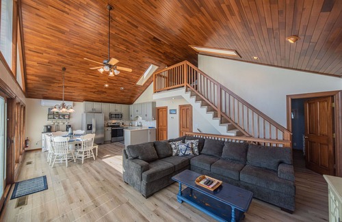 The home sits on a gentle slope to the lake (safe for children), has a private double bay covered dock for use during your stay, large driveway and several amenities.