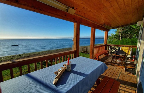 This property is unique because it's the only cabin literally on the beach for miles either direction. The Puget Sound is immediately beyond the lawn covered bulkhead and covered porch. You may enjoy beach fires at night, with the Puget Sound on one side of you and the covered porch on the other.