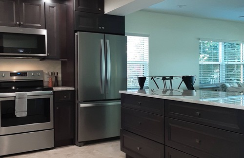 Modern open kitchen with top-notch appliances: stove, oven, microwave, Keurig, and more.
