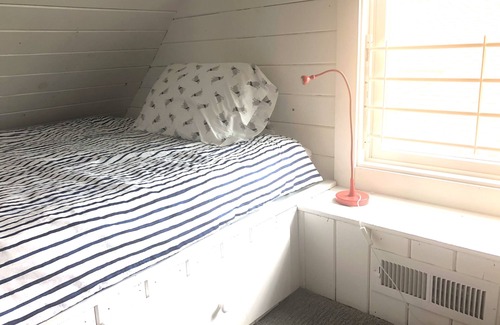 Three bedrooms- master with private full bath, a queen bed and a balcony, second with a full bed, balcony and shared full bath. Third bedroom is the entire third floor of the house with two full beds and balcony overlooking Long Island sound. Second floor office includes washer/dryer, apple TV and a outdoor seating area. Additional apple TV in family room.