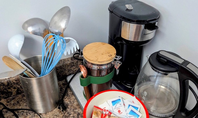 WELL-EQUIPPED KITCHENETTE: While not a full kitchen, the kitchenette is thoughtfully equipped with modern conveniences for preparing simple meals. The grocer is not much more than a hop-skip-and-a-jump distance away. The kitchenette includes a medium-sized fridge, microwave, toaster, dual conduction burners, and a versatile air fryer/convection oven. All the necessary cookware, dishes, and utensils are provided.