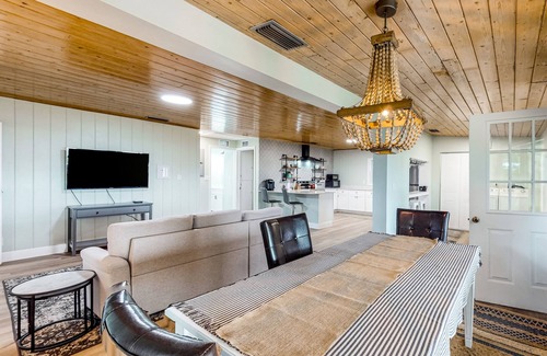 Inside your home away from home, discover updated living quarters and charming finishes. Sit back and enjoy watching your favorite TV shows and movies on the large TV in the living room. Or, don your chef's hat and utilize the well-equipped kitchen's stainless steel appliances and gleaming countertops. The separate guest house also comes equipped with a kitchenette, ensuring there's enough room for everyone to prepare and store their meals.